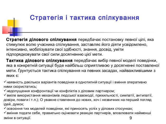 9. 9. 9 Стратегія і тактика спілкування Стратегія ділового спілкування передбачає постановку певної цілі, яка стимулює волю учасника спілкування, заставляє його діяти усвідомлено, інтенсивно, мобілізувати свої здібності, знання, досвід, уміти підпорядковувати свої сили досягненню цієї мети. Тактика ділового спілкування передбачає вибір певної моделі поведінки, яка в конкретній ситуації буде найбільш сприятливою у досягненні поставленої мети. Ґрунтується тактика спілкування на певних засадах, найважливішими з яких є: наявність декількох варіантів поведінки в однотипній ситуації і вміння оперативно ними скористатись; недопущення конфронтації чи конфліктів з діловим партнером; вміле використання механізмів людської взаємодії, прихильності, симпатії, антипатії, довіри, поваги і т.п.); О уважне ставлення до нових, хоч і незвичних на перший погляд ідей, думок; освоєння тих моделей поведінки, які приносять успіх у ділових стосунках; вміння подати себе, правильно оцінювати реакцію партнерів, вловлювати найменші зміни в ситуації.