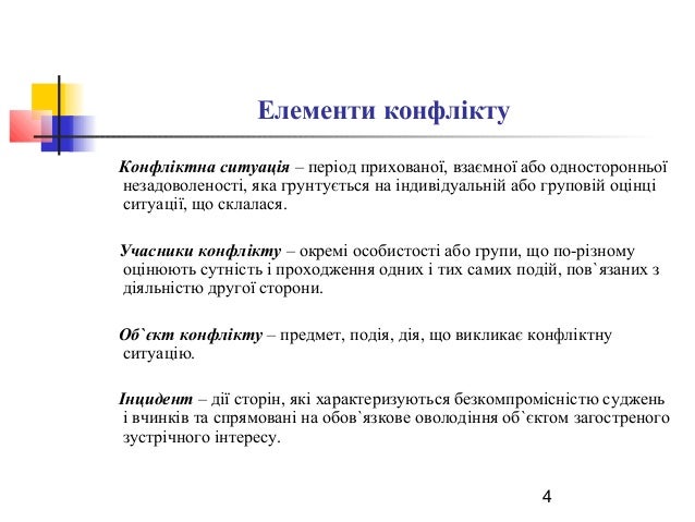 4. 4. 4 Елементи конфлікту Конфліктна ситуація – період прихованої, взаємної або односторонньої незадоволеності, яка грунтується на індивідуальній або груповій оцінці ситуації, що склалася. Учасники конфлікту – окремі особистості або групи, що по-різному оцінюють сутність і проходження одних і тих самих подій, пов`язаних з діяльністю другої сторони. Об`єкт конфлікту – предмет, подія, дія, що викликає конфліктну ситуацію. Інцидент – дії сторін, які характеризуються безкомпромісністю суджень і вчинків та спрямовані на обов`язкове оволодіння об`єктом загостреного зустрічного інтересу.