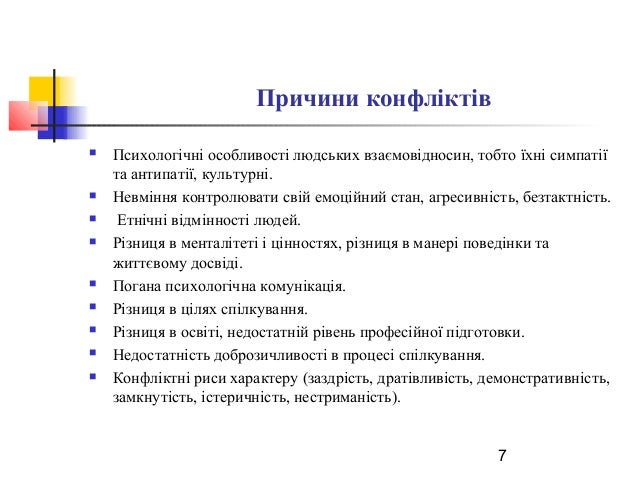 7. 7. 7 Причини конфліктів  Психологічні особливості людських взаємовідносин, тобто їхні симпатії та антипатії, культурні.  Невміння контролювати свій емоційний стан, агресивність, безтактність.  Етнічні відмінності людей.  Різниця в менталітеті і цінностях, різниця в манері поведінки та життєвому досвіді.  Погана психологічна комунікація.  Різниця в цілях спілкування.  Різниця в освіті, недостатній рівень професійної підготовки.  Недостатність доброзичливості в процесі спілкування.  Конфліктні риси характеру (заздрість, дратівливість, демонстративність, замкнутість, істеричність, нестриманість).