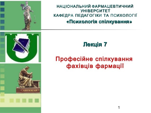 1. 1. 1 НАЦІОНАЛЬНИЙ ФАРМАЦЕВТИЧНИЙНАЦІОНАЛЬНИЙ ФАРМАЦЕВТИЧНИЙ УНІВЕРСИТЕТУНІВЕРСИТЕТ КАФЕДРА ПЕДАГОГІКИ ТА ПСИХОЛОГІЇКАФЕДРА ПЕДАГОГІКИ ТА ПСИХОЛОГІЇ «Психологія спілкування»«Психологія спілкування» Лекція 7Лекція 7 Професійне спілкування фахівців фармації