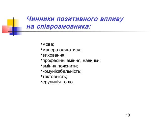10. 10. 10 Чинники позитивного впливу на співрозмовника: мова; манера одягатися; виховання; професійні вміння, навички; вміння пояснити; комунікабельність; тактовність; ерудиція тощо.