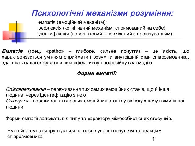 11. 11. 11 Психологічні механізми розуміння: Емпатія (грец. «patho» – глибоке, сильне почуття) – це якість, що характеризується умінням сприймати і розуміти внутрішній стан співрозмовника, здатність налагоджувати з ним ефек­тивну професійну взаємодію. емпатія (емоційний механізм); рефлексія (когнітивний механізм, спрямований на себе); ідентифікація (поведінковий – пов’язаний з наслідуванням). Форми емпатії: Співпереживання – переживання тих самих емоційних станів, що й інша людина, через ідентифікацію з нею; Співчуття – переживання власних емоційних станів у зв’язку з почуттями іншої людини Форми емпатії залежать від типу та характеру міжособистісних стосунків. Емоційна емпатія ґрунтується на наслідуванні почуттям та реакціям співрозмовника.