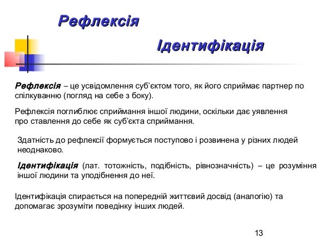 13. 13. 13 РефлексіяРефлексія Рефлексія – це усвідомлення суб’єктом того, як його сприймає партнер по спілкуванню (погляд на себе з боку). Рефлексія поглиблює сприймання іншої людини, оскільки дає уявлення про ставлення до себе як суб’єкта сприймання. Здатність до рефлексії формується поступово і розвинена у різних людей неоднаково. ІдентифікаціяІдентифікація Ідентифікація (лат. тотожність, подібність, рівнозначність) – це розуміння іншої людини та уподібнення до неї. Ідентифікація спирається на попередній життєвий досвід (аналогію) та допомагає зрозуміти поведінку інших людей.