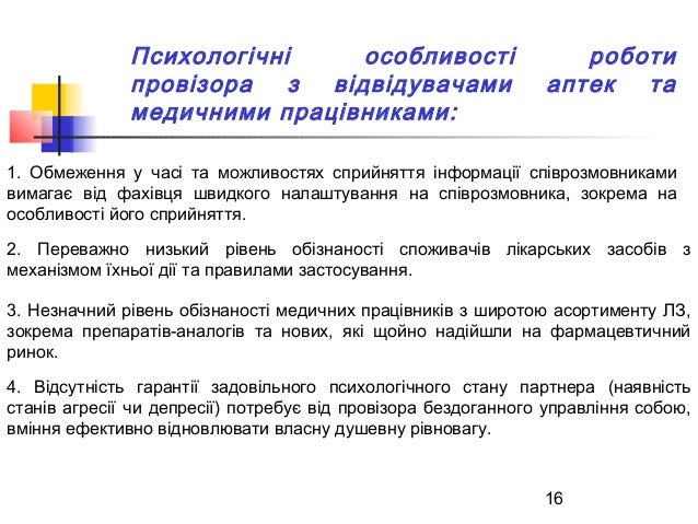 16. 16. 16 Психологічні особливості роботи провізора з відвідувачами аптек та медичними працівниками: 1. Обмеження у часі та можливостях сприйняття інформації співрозмовниками вимагає від фахівця швидкого налаштування на співрозмовника, зокрема на особливості його сприйняття. 2. Переважно низький рівень обізнаності споживачів лікарських засобів з механізмом їхньої дії та правилами застосування. 3. Незначний рівень обізнаності медичних працівників з широтою асортименту ЛЗ, зокрема препаратів-аналогів та нових, які щойно надійшли на фармацевтичний ринок. 4. Відсутність гарантії задовільного психологічного стану партнера (наявність станів агресії чи депресії) потребує від провізора бездоганного управління собою, вміння ефективно відновлювати власну душевну рівновагу.