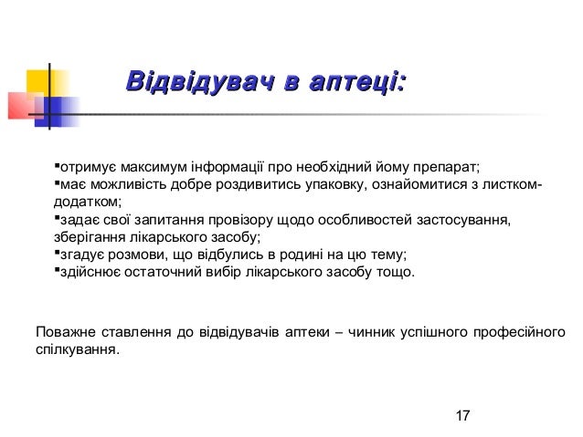 17. 17. 17 Відвідувач в аптеці:Відвідувач в аптеці: отримує максимум інформації про необхідний йому препарат; має можливість добре роздивитись упаковку, ознайомитися з листком- додатком; задає свої запитання провізору щодо особливостей застосування, зберігання лікарського засобу; згадує розмови, що відбулись в родині на цю тему; здійснює остаточний вибір лікарського засобу тощо. Поважне ставлення до відвідувачів аптеки – чинник успішного професійного спілкування.
