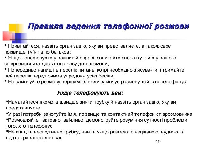 19. 19. 19 Правила ведення телефонної розмовиПравила ведення телефонної розмови  Привітайтеся, назвіть організацію, яку ви представляєте, а також своє прізвище, ім’я та по батькові;  Якщо телефонуєте у важливій справі, запитайте спочатку, чи є у вашого співрозмовника достатньо часу для розмови;  Попередньо напишіть перелік питань, котрі необхідно з’ясува­ти, і тримайте цей перелік перед очима упродовж усієї бесіди:  Не закінчуйте розмову першим: завжди закінчує розмову той, хто телефонує. Якщо телефонують вам: Намагайтеся якомога швидше зняти трубку й назвіть організацію, яку ви представляєте У разі потреби занотуйте ім’я, прізвище та контактний телефон співрозмовника Розмовляйте тактовно, ввічливо: демонструйте розуміння сутності проблеми того, хто телефонує Не кладіть несподівано трубку, навіть якщо розмова є нецікавою, нудною та надто тривалою для вас.
