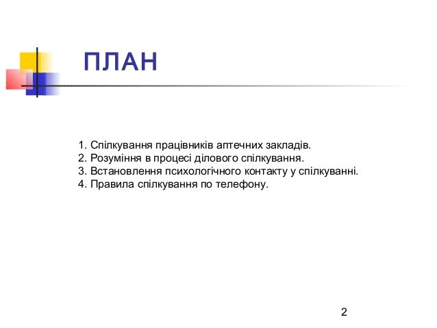 2. 2. 2 ПЛАН 1. Спілкування працівників аптечних закладів. 2. Розуміння в процесі ділового спілкування. 3. Встановлення психологічного контакту у спілкуванні. 4. Правила спілкування по телефону.