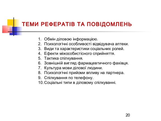 20. 20. 20 ТЕМИ РЕФЕРАТІВ ТА ПОВІДОМЛЕНЬ 1. Обмін діловою інформацією. 2. Психологічні особливості відвідувача аптеки. 3. Види та характеристики соціальних ролей. 4. Ефекти міжособистісного сприйняття. 5. Тактика спілкування. 6. Зовнішній вигляд фармацевтичного фахівця. 7. Культура мови ділової людини. 8. Психологічні прийоми впливу на партнера. 9. Спілкування по телефону. 10.Соціальні типи в діловому спілкуванні.