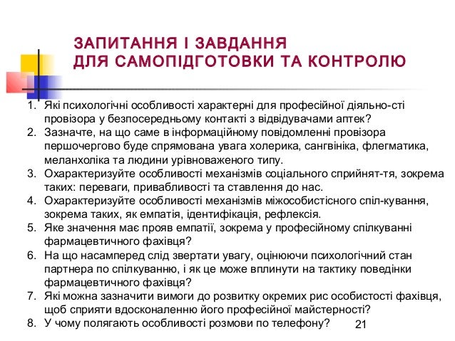 21. 21. 21 ЗАПИТАННЯ І ЗАВДАННЯ ДЛЯ САМОПІДГОТОВКИ ТА КОНТРОЛЮ 1. Які психологічні особливості характерні для професійної діяльно­сті провізора у безпосередньому контакті з відвідувачами аптек? 2. Зазначте, на що саме в інформаційному повідомленні провізора першочергово буде спрямована увага холерика, сангвініка, флегматика, меланхоліка та людини урівноваженого типу. 3. Охарактеризуйте особливості механізмів соціального сприйнят­тя, зокрема таких: переваги, привабливості та ставлення до нас. 4. Охарактеризуйте особливості механізмів міжособистісного спіл­кування, зокрема таких, як емпатія, ідентифікація, рефлексія. 5. Яке значення має прояв емпатії, зокрема у професійному спілкуванні фармацевтичного фахівця? 6. На що насамперед слід звертати увагу, оцінюючи психологічний стан партнера по спілкуванню, і як це може вплинути на тактику поведінки фармацевтичного фахівця? 7. Які можна зазначити вимоги до розвитку окремих рис особистості фахівця, щоб сприяти вдосконаленню його професійної майстерності? 8. У чому полягають особливості розмови по телефону?