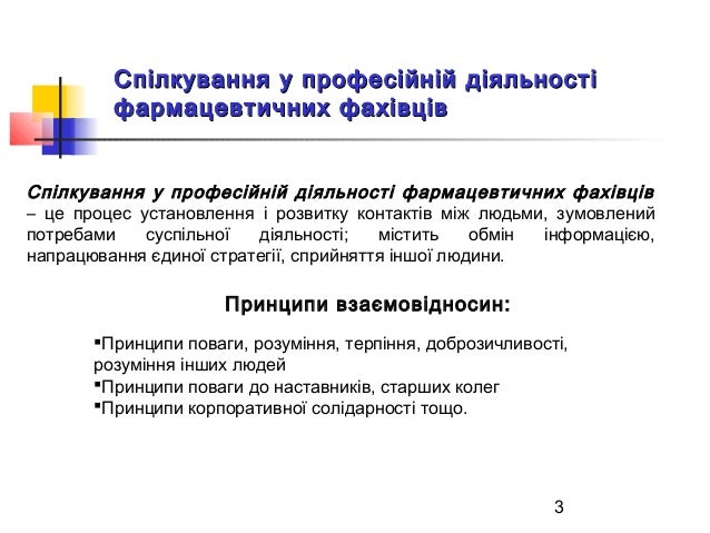 3. 3. 3 Спілкування у професійній діяльностіСпілкування у професійній діяльності фармацевтичних фахівцівфармацевтичних фахівців Спілкування у професійній діяльності фармацевтичних фахівців – це процес установлення і розвитку контактів між людьми, зумовлений потребами суспільної діяльності; містить обмін інформацією, напрацювання єдиної стратегії, сприйняття іншої людини. Принципи взаємовідносин: Принципи поваги, розуміння, терпіння, доброзичливості, розуміння інших людей Принципи поваги до наставників, старших колег Принципи корпоративної солідарності тощо.