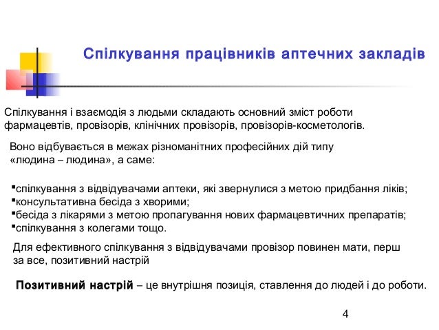 4. 4. 4 Спілкування працівників аптечних закладів Спілкування і взаємодія з людьми складають основний зміст роботи фармацевтів, провізорів, клінічних провізорів, провізорів-косметологів. Воно відбувається в межах різноманітних професійних дій типу «людина – людина», а саме: спілкування з відвідувачами аптеки, які звернулися з метою придбання ліків; консультативна бесіда з хворими; бесіда з лікарями з метою пропагування нових фармацевтичних препаратів; спілкування з колегами тощо. Для ефективного спілкування з відвідувачами провізор повинен мати, перш за все, позитивний настрій Позитивний настрій – це внутрішня позиція, ставлення до людей і до роботи.