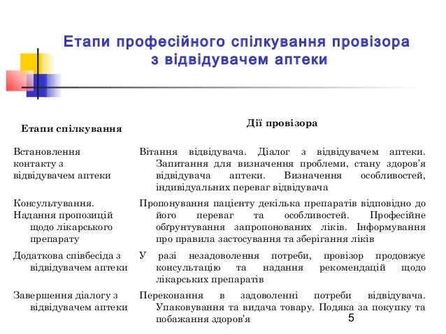 5. 5. 5 Етапи професійного спілкування провізора з відвідувачем аптеки Етапи спілкування Дії провізора Встановлення контакту з відвідувачем аптеки Вітання відвідувача. Діалог з відвідувачем аптеки. Запитання для визначення проблеми, стану здоров’я відвідувача аптеки. Визначення особливостей, індивідуальних переваг відвідувача Консультування. Надання пропозицій щодо лікарського препарату Пропонування пацієнту декілька препаратів відповідно до його переваг та особливостей. Професійне обґрунтування запропонованих ліків. Інформування про правила застосування та зберігання ліків Додаткова співбесіда з відвідувачем аптеки У разі незадоволення потреби, провізор продовжує консультацію та надання рекомендацій щодо лікарських препаратів Завершення діалогу з відвідувачем аптеки Переконання в задоволенні потреби відвідувача. Упаковування та видача товару. Подяка за покупку та побажання здоров’я