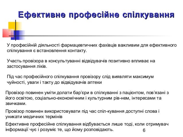6. 6. 6 У професійній діяльності фармацевтичних фахівців важливим для ефективного спілкування є встановлення контакту. Ефективне професійне спілкуванняЕфективне професійне спілкування Участь провізора в консультуванні відвідувачів позитивно впливає на застосування ліків. Під час професійного спілкування провізору слід виявляти максимум чуйності, уваги і такту до відвідувачів аптеки Провізор повинен уміти долати бар’єри в спілкуванні з пацієнтом, пов’язані з його освітою, соціально-економічним і культурним рів­нем, інтересами та звичками. Провізор повинен використовувати під час спіл­кування доступні слова і уникати медичних термінів Ефективне професійне спілкування відбувається лише тоді, коли отримувач інформації чує і розуміє те, що йому розповідають.