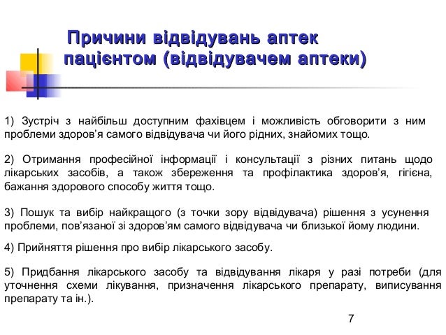 7. 7. 7 Причини відвідувань аптекПричини відвідувань аптек пацієнтом (відвідувачем аптеки)пацієнтом (відвідувачем аптеки) 1) Зустріч з найбільш доступним фахівцем і можливість обговорити з ним проблеми здоров’я самого відвідувача чи його рідних, знайомих тощо. 2) Отримання професійної інформації і консультації з різних питань щодо лікарських засобів, а також збереження та профілактика здоров’я, гігієна, бажання здорового способу життя тощо. 3) Пошук та вибір найкращого (з точки зору відвідувача) рішення з усунення проблеми, пов’язаної зі здоров’ям самого відвідувача чи близької йому людини. 4) Прийняття рішення про вибір лікарського засобу. 5) Придбання лікарського засобу та відвідування лікаря у разі потреби (для уточнення схеми лікування, призначення лікарського препарату, виписування препарату та ін.).