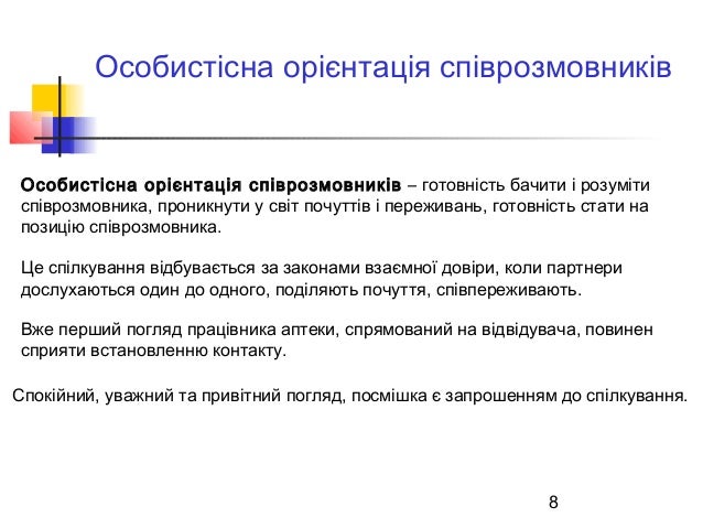 8. 8. 8 Особистісна орієнтація співрозмовників Особистісна орієнтація співрозмовників – готовність бачити і розуміти співрозмовника, проникнути у світ почуттів і переживань, готовність стати на позицію співрозмовника. Це спілкування відбувається за законами взаємної довіри, коли партнери дослухаються один до одного, поділяють почуття, співпереживають. Вже перший погляд працівника аптеки, спрямований на відвідувача, повинен сприяти встановленню контакту. Спокійний, уважний та привітний погляд, посмішка є запрошенням до спілкування.
