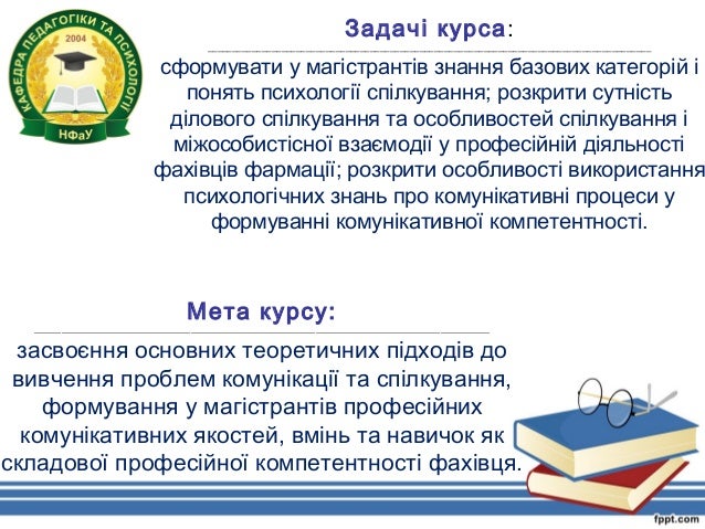 3. 3. Мета курсу: ______________________________________________________________________________________________________ засвоєння основних теоретичних підходів до вивчення проблем комунікації та спілкування, формування у магістрантів професійних комунікативних якостей, вмінь та навичок як складової професійної компетентності фахівця. Задачі курса: __________________________________________________________________________________________ сформувати у магістрантів знання базових категорій і понять психології спілкування; розкрити сутність ділового спілкування та особливостей спілкування і міжособистісної взаємодії у професійній діяльності фахівців фармації; розкрити особливості використання психологічних знань про комунікативні процеси у формуванні комунікативної компетентності.