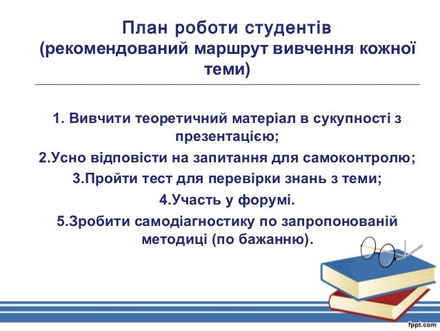4. 4. План роботи студентів (рекомендований маршрут вивчення кожної теми) __________________________________________________________________________________________________________________ 1. Вивчити теоретичний матеріал в сукупності з презентацією; 2.Усно відповісти на запитання для самоконтролю; 3.Пройти тест для перевірки знань з теми; 4.Участь у форумі. 5.Зробити самодіагностику по запропонованій методиці (по бажанню).