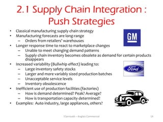 14. 14. 2.1 Supply Chain Integration : Push Strategies• Classical manufacturing supply chain strategy• Manufacturing forecasts are long-range – Orders from retailers’ warehouses• Longer response time to react to marketplace changes – Unable to meet changing demand patterns – Supply chain inventory becomes obsolete as demand for certain products disappears• Increased variability (Bullwhip effect) leading to: – Large inventory safety stocks – Larger and more variably sized production batches – Unacceptable service levels – Inventory obsolescence• Inefficient use of production facilities (factories) – How is demand determined? Peak? Average? – How is transportation capacity determined?• Examples: Auto industry, large appliances, others? Y.Serroukh – Anglais Commercial 14