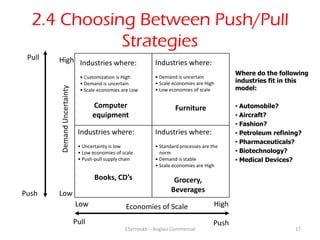 17. 17. 2.4 Choosing Between Push/Pull Strategies Pull High Industries where: Industries where: Where do the following • Customization is High • Demand is uncertain • Demand is uncertain • Scale economies are High industries fit in this model: Demand Uncertainty • Scale economies are Low • Low economies of scale Computer Furniture • Automobile? equipment • Aircraft? • Fashion? Industries where: Industries where: • Petroleum refining? • Pharmaceuticals? • Uncertainty is low • Standard processes are the • Low economies of scale norm • Biotechnology? • Push-pull supply chain • Demand is stable • Medical Devices? • Scale economies are High Books, CD’s Grocery,Push Low Beverages Low Economies of Scale High Pull Push Y.Serroukh – Anglais Commercial 17