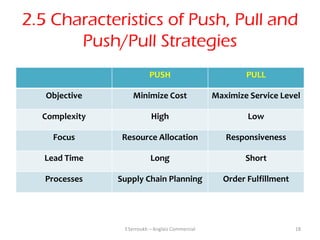 18. 18. 2.5 Characteristics of Push, Pull and Push/Pull Strategies PUSH PULL Objective Minimize Cost Maximize Service Level Complexity High Low Focus Resource Allocation Responsiveness Lead Time Long Short Processes Supply Chain Planning Order Fulfillment Y.Serroukh – Anglais Commercial 18