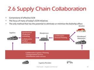 19. 19. 2.6 Supply Chain Collaboration• Cornerstone of effective SCM• The focus of many of today’s SCM initiatives• The only method that has the potential to eliminate or minimize the Bullwhip effect Retailers Suppliers Synchronized Manufacturer Production Scheduling Collaborative Distributors/ Demand Planning Collaborative Wholesalers Product Development Collaborative Logistics Planning •Transportation services •Distribution center services Logistics Providers Y.Serroukh – Anglais Commercial 19