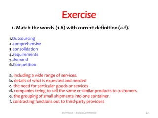 22. 22. Exercise 1. Match the words (1-6) with correct definition (a-f).1.Outsourcing2.comprehensive3.consolidation4.requirements5.demand6.Competitiona. including a wide range of services.b. details of what is expected and neededc. the need for particular goods or servicesd. companies trying to sell the same or similar products to customerse. the grouping of small shipments into one container.f. contracting functions out to third-party providers Y.Serroukh – Anglais Commercial 22