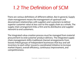 5. 5. 1.2 The Definition of SCMThere are various definitions of different edition. But in general, Supplychain management means the management of upstream anddownstream relationships with suppliers and customers to deliversuperior customer value at less cost to the supply chain as a whole. Thesupply chain arrangement links a firm and its distributive and suppliernetwork to end customers.The integrated value-creation process must be managed from materialprocurement to end-customer product delivery. The integrated supplychain management shifts traditional channel arrangements fromloosely linked groups of independent businesses that buy and sellinventory to each other toward a coordinated initiative to increasemarket impact, overall efficiency, continuous improvement, andcompetitiveness. Y.Serroukh – Anglais Commercial 5