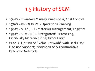 9. 9. 1.5 History of SCM• 1960’s - Inventory Management Focus, Cost Control• 1970’s - MRP & BOM - Operations Planning• 1980’s - MRPII, JIT - Materials Management, Logistics• 1990’s - SCM - ERP - “Integrated” Purchasing, Financials, Manufacturing, Order Entry• 2000’s - Optimized “Value Network” with Real-Time Decision Support; Synchronized & Collaborative Extended Network Y.Serroukh – Anglais Commercial 9