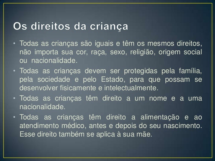 2. 2. • Todas as crianças são iguais e têm os mesmos direitos, não importa sua cor, raça, sexo, religião, origem social ou nacionalidade.• Todas as crianças devem ser protegidas pela família, pela sociedade e pelo Estado, para que possam se desenvolver fisicamente e intelectualmente.• Todas as crianças têm direito a um nome e a uma nacionalidade.• Todas as crianças têm direito a alimentação e ao atendimento médico, antes e depois do seu nascimento. Esse direito também se aplica à sua mãe.