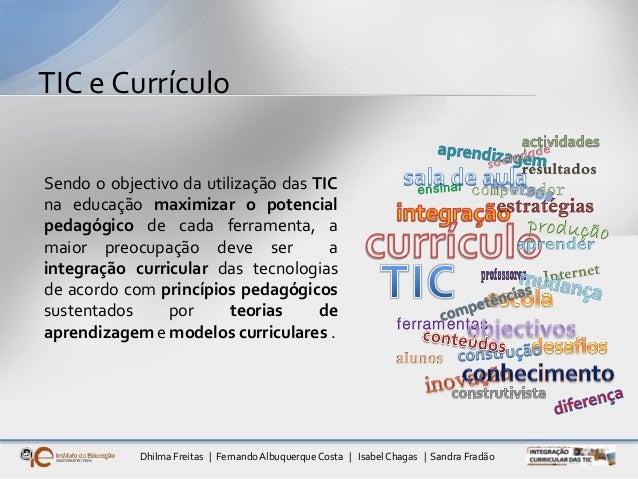 17. 17. Dhilma Freitas | FernandoAlbuquerqueCosta | Isabel Chagas | Sandra Fradão TIC e Currículo Sendo o objectivo da utilização das TIC na educação maximizar o potencial pedagógico de cada ferramenta, a maior preocupação deve ser a integração curricular das tecnologias de acordo com princípios pedagógicos sustentados por teorias de aprendizagem e modelos curriculares .