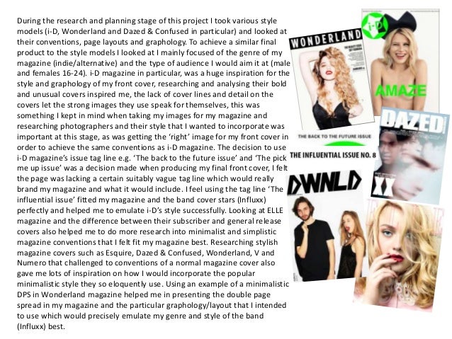 1. 1. During the research and planning stage of this project I took various stylemodels (i-D, Wonderland and Dazed & Confused in particular) and looked attheir conventions, page layouts and graphology. To achieve a similar finalproduct to the style models I looked at I mainly focused of the genre of mymagazine (indie/alternative) and the type of audience I would aim it at (maleand females 16-24). i-D magazine in particular, was a huge inspiration for thestyle and graphology of my front cover, researching and analysing their boldand unusual covers inspired me, the lack of cover lines and detail on thecovers let the strong images they use speak for themselves, this wassomething I kept in mind when taking my images for my magazine andresearching photographers and their style that I wanted to incorporate wasimportant at this stage, as was getting the ‘right’ image for my front cover inorder to achieve the same conventions as i-D magazine. The decision to usei-D magazine’s issue tag line e.g. ‘The back to the future issue’ and ‘The pickme up issue’ was a decision made when producing my final front cover, I feltthe page was lacking a certain suitably vague tag line which would reallybrand my magazine and what it would include. I feel using the tag line ‘Theinfluential issue’ fitted my magazine and the band cover stars (Influxx)perfectly and helped me to emulate i-D’s style successfully. Looking at ELLEmagazine and the difference between their subscriber and general releasecovers also helped me to do more research into minimalist and simplisticmagazine conventions that I felt fit my magazine best. Researching stylishmagazine covers such as Esquire, Dazed & Confused, Wonderland, V andNumero that challenged to conventions of a normal magazine cover alsogave me lots of inspiration on how I would incorporate the popularminimalistic style they so eloquently use. Using an example of a minimalisticDPS in Wonderland magazine helped me in presenting the double pagespread in my magazine and the particular graphology/layout that I intendedto use which would precisely emulate my genre and style of the band(Influxx) best.