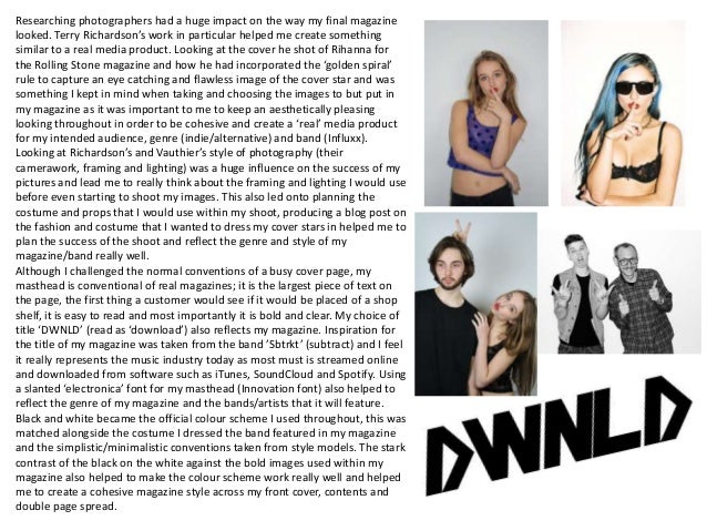2. 2. Researching photographers had a huge impact on the way my final magazinelooked. Terry Richardson’s work in particular helped me create somethingsimilar to a real media product. Looking at the cover he shot of Rihanna forthe Rolling Stone magazine and how he had incorporated the ‘golden spiral’rule to capture an eye catching and flawless image of the cover star and wassomething I kept in mind when taking and choosing the images to but put inmy magazine as it was important to me to keep an aesthetically pleasinglooking throughout in order to be cohesive and create a ‘real’ media productfor my intended audience, genre (indie/alternative) and band (Influxx).Looking at Richardson’s and Vauthier’s style of photography (theircamerawork, framing and lighting) was a huge influence on the success of mypictures and lead me to really think about the framing and lighting I would usebefore even starting to shoot my images. This also led onto planning thecostume and props that I would use within my shoot, producing a blog post onthe fashion and costume that I wanted to dress my cover stars in helped me toplan the success of the shoot and reflect the genre and style of mymagazine/band really well.Although I challenged the normal conventions of a busy cover page, mymasthead is conventional of real magazines; it is the largest piece of text onthe page, the first thing a customer would see if it would be placed of a shopshelf, it is easy to read and most importantly it is bold and clear. My choice oftitle ‘DWNLD’ (read as ‘download’) also reflects my magazine. Inspiration forthe title of my magazine was taken from the band ’Sbtrkt’ (subtract) and I feelit really represents the music industry today as most must is streamed onlineand downloaded from software such as iTunes, SoundCloud and Spotify. Usinga slanted ‘electronica’ font for my masthead (Innovation font) also helped toreflect the genre of my magazine and the bands/artists that it will feature.Black and white became the official colour scheme I used throughout, this wasmatched alongside the costume I dressed the band featured in my magazineand the simplistic/minimalistic conventions taken from style models. The starkcontrast of the black on the white against the bold images used within mymagazine also helped to make the colour scheme work really well and helpedme to create a cohesive magazine style across my front cover, contents anddouble page spread.