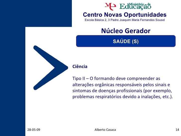 13. 13. Centro Novas Oportunidades Escola Básica 2, 3 Padre Joaquim Maria Fernandes Sousel Alberto Casaca 10-06-09 Ciência Tipo I – Identificar efeitos no organismo (por exemplo, problemas de visão ou audição, desvios de coluna, doenças do foro respiratório, desequilíbrios emocionais, etc.) decorrentes de práticas profissionais. Núcleo Gerador SAÚDE (S)