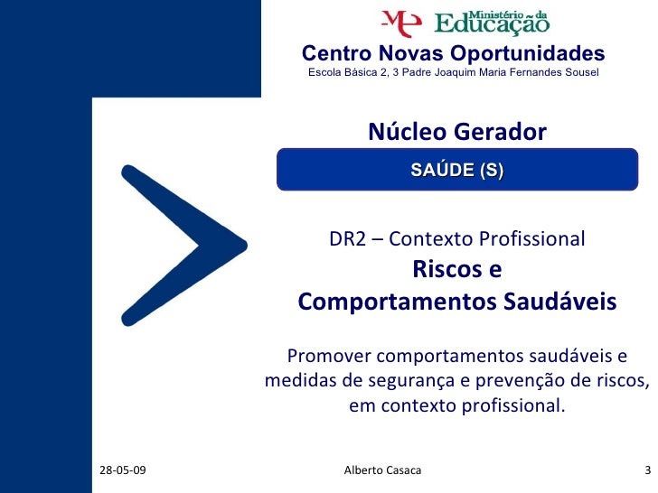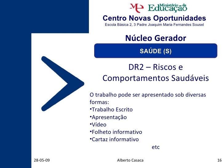 16. 16. Centro Novas Oportunidades Escola Básica 2, 3 Padre Joaquim Maria Fernandes Sousel Alberto Casaca 10-06-09 <ul><li>DR2 – Riscos e </li></ul><ul><li>Comportamentos Saudáveis </li></ul><ul><li>O trabalho pode ser apresentado sob diversas formas: </li></ul><ul><li>Trabalho Escrito </li></ul><ul><li>Apresentação </li></ul><ul><li>Vídeo </li></ul><ul><li>Folheto informativo </li></ul><ul><li>Cartaz informativo </li></ul><ul><li>etc </li></ul>Núcleo Gerador SAÚDE (S)