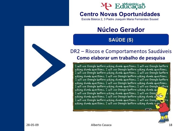 18. 18. Centro Novas Oportunidades Escola Básica 2, 3 Padre Joaquim Maria Fernandes Sousel Alberto Casaca 10-06-09 DR2 – Riscos e Comportamentos Saudáveis Como elaborar um trabalho de pesquisa Núcleo Gerador SAÚDE (S)