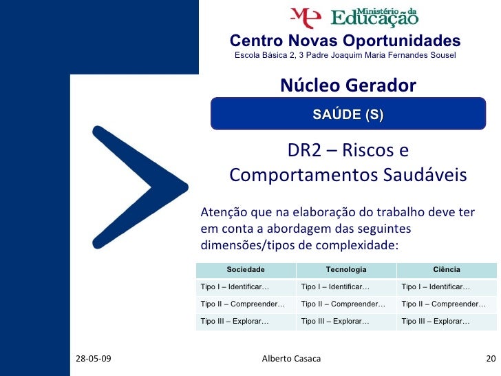 20. 20. Centro Novas Oportunidades Escola Básica 2, 3 Padre Joaquim Maria Fernandes Sousel Alberto Casaca 10-06-09 DR2 – Riscos e Comportamentos Saudáveis Atenção que na elaboração do trabalho deve ter em conta a abordagem das seguintes dimensões/tipos de complexidade: Núcleo Gerador SAÚDE (S) Sociedade Tecnologia Ciência Tipo I – Identificar… Tipo I – Identificar… Tipo I – Identificar… Tipo II – Compreender… Tipo II – Compreender… Tipo II – Compreender… Tipo III – Explorar… Tipo III – Explorar… Tipo III – Explorar…