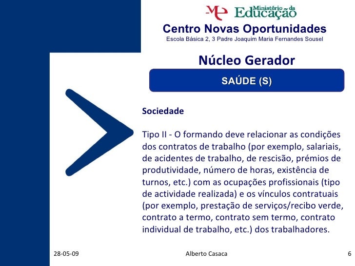 6. 6. Centro Novas Oportunidades Escola Básica 2, 3 Padre Joaquim Maria Fernandes Sousel Alberto Casaca 10-06-09 Sociedade Tipo II - O formando deve relacionar as condições dos contratos de trabalho (por exemplo, salariais, de acidentes de trabalho, de rescisão, prémios de produtividade, número de horas, existência de turnos, etc.) com as ocupações profissionais (tipo de actividade realizada) e os vínculos contratuais (por exemplo, prestação de serviços/recibo verde, contrato a termo, contrato sem termo, contrato individual de trabalho, etc.) dos trabalhadores. Núcleo Gerador SAÚDE (S)