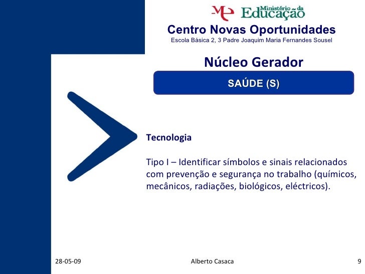 9. 9. Centro Novas Oportunidades Escola Básica 2, 3 Padre Joaquim Maria Fernandes Sousel Alberto Casaca 10-06-09 Tecnologia Tipo I – Identificar símbolos e sinais relacionados com prevenção e segurança no trabalho (químicos, mecânicos, radiações, biológicos, eléctricos). Núcleo Gerador SAÚDE (S)