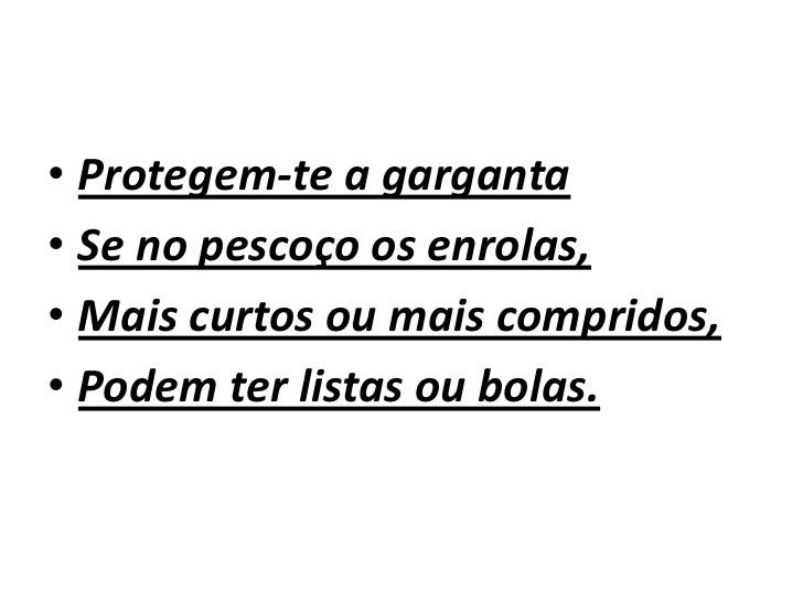 2. 2. Protegem-te a garganta Se no pescoço os enrolas, Mais curtos ou mais compridos, Podem ter listas ou bolas.