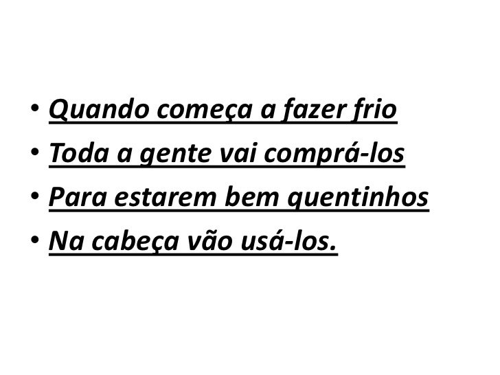 4. 4. Quando começa a fazer frio Toda a gente vai comprá-los Para estarem bem quentinhos Na cabeça vão usá-los.