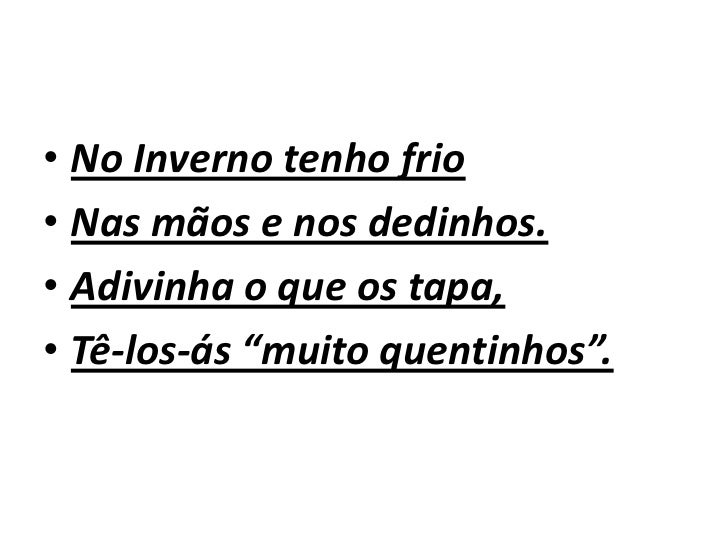 6. 6. No Inverno tenho frio Nas mãos e nos dedinhos. Adivinha o que os tapa, Tê-los-ás “muito quentinhos”.