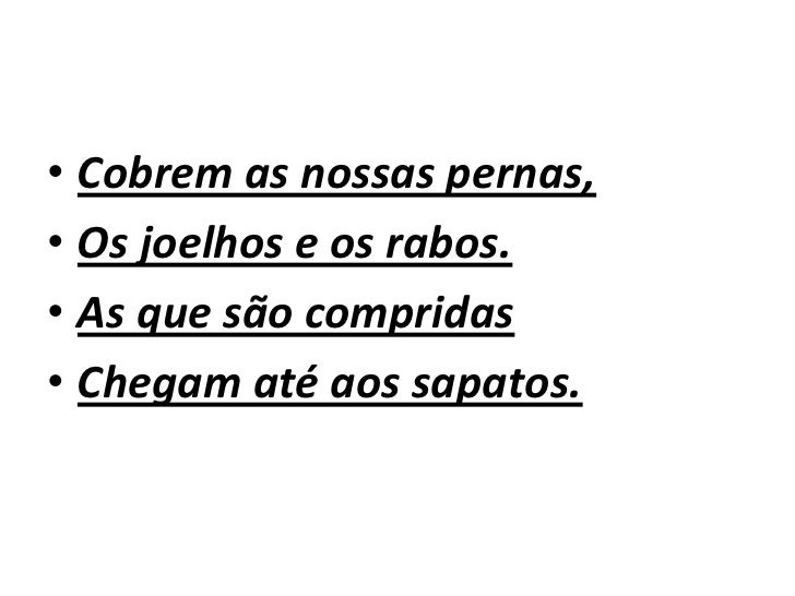 8. 8. Cobrem as nossas pernas, Os joelhos e os rabos. As que são compridas Chegam até aos sapatos.
