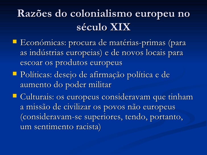 3. 3. Razões do colonialismo europeu no século XIX <ul><li>Económicas: procura de matérias-primas (para as indústrias europeias) e de novos locais para escoar os produtos europeus </li></ul><ul><li>Políticas: desejo de afirmação política e de aumento do poder militar </li></ul><ul><li>Culturais: os europeus consideravam que tinham a missão de civilizar os povos não europeus (consideravam-se superiores, tendo, portanto, um sentimento racista) </li></ul>