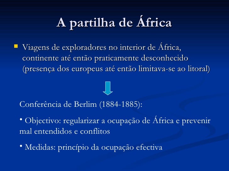 4. 4. A partilha de África <ul><li>Viagens de exploradores no interior de África, continente até então praticamente desconhecido (presença dos europeus até então limitava-se ao litoral) </li></ul><ul><li>Conferência de Berlim (1884-1885): </li></ul><ul><li>Objectivo: regularizar a ocupação de África e prevenir mal entendidos e conflitos </li></ul><ul><li>Medidas: princípio da ocupação efectiva </li></ul>