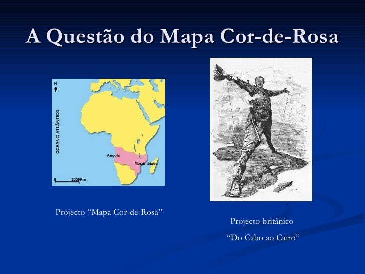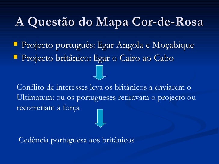 5. 5. A Questão do Mapa Cor-de-Rosa <ul><li>Projecto português: ligar Angola e Moçabique </li></ul><ul><li>Projecto britânico: ligar o Cairo ao Cabo </li></ul>Conflito de interesses leva os britânicos a enviarem o Ultimatum: ou os portugueses retiravam o projecto ou recorreriam à força Cedência portuguesa aos britânicos