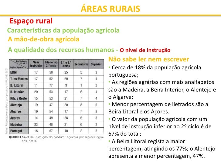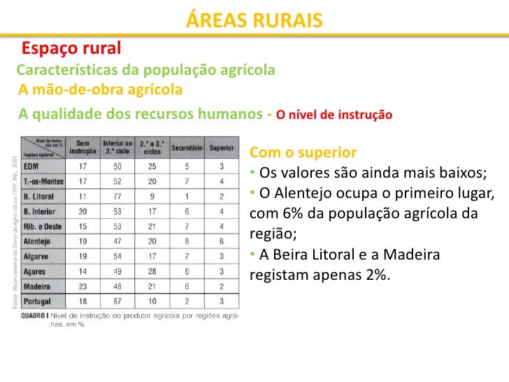 15. 15. ÁREAS RURAIS Espaço rural Características da população agrícola A mão-de-obra agrícola A qualidade dos recursos humanos - O nível de instrução Com o superior • Os valores são ainda mais baixos; • O Alentejo ocupa o primeiro lugar, com 6% da população agrícola da região; • A Beira Litoral e a Madeira registam apenas 2%.