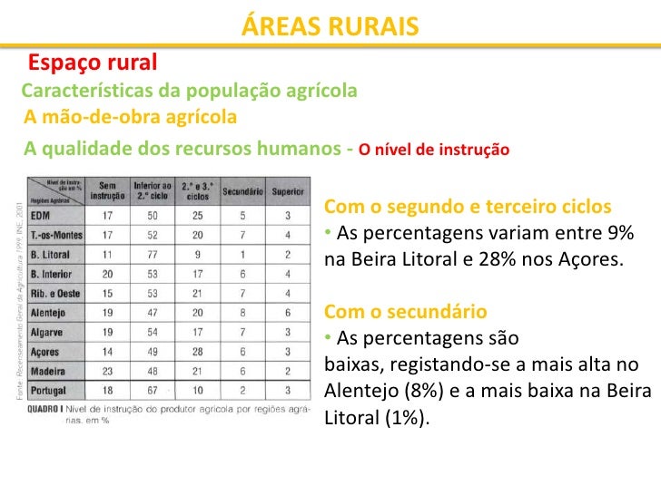 4. 4. ÁREAS RURAIS Espaço rural Características da população agrícola A mão-de-obra agrícola A qualidade dos recursos humanos A qualidade dos recursos humanos avalia-se utilizando 3 indicadores: • a estrutura etária • o nível de instrução • a estrutura socioprofissional