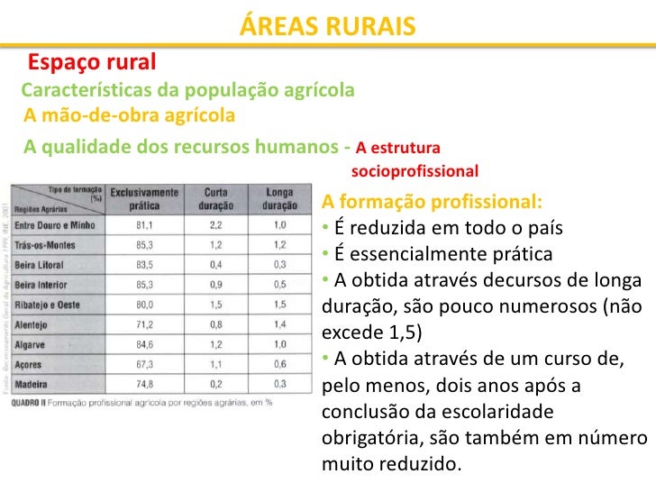 16. 16. ÁREAS RURAIS Espaço rural Características da população agrícola A mão-de-obra agrícola A qualidade dos recursos humanos - A estrutura socioprofissional A formação profissional: • É reduzida em todo o país • É essencialmente prática • A obtida através decursos de longa duração, são pouco numerosos (não excede 1,5) • A obtida através de um curso de, pelo menos, dois anos após a conclusão da escolaridade obrigatória, são também em número muito reduzido.