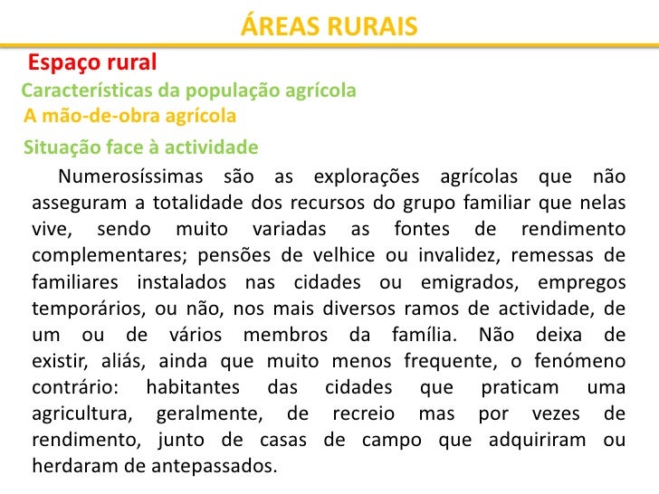 2. 2. ÁREAS RURAIS Espaço rural Características da população agrícola A mão-de-obra agrícola Proveniência da mão-de-obra utilizada: Quase 50% do total da mão-de-obrade 40% da população agrícola A mão-de-obra não familiar constitui mais familiar, devido ao predomínio total, devido a dimensão das propriedades que atingem valores médios entre 10 e da pequena propriedade de 50 hectares no Alentejo. 50 ha, no primeiro caso, e mais