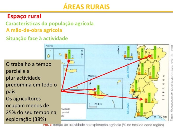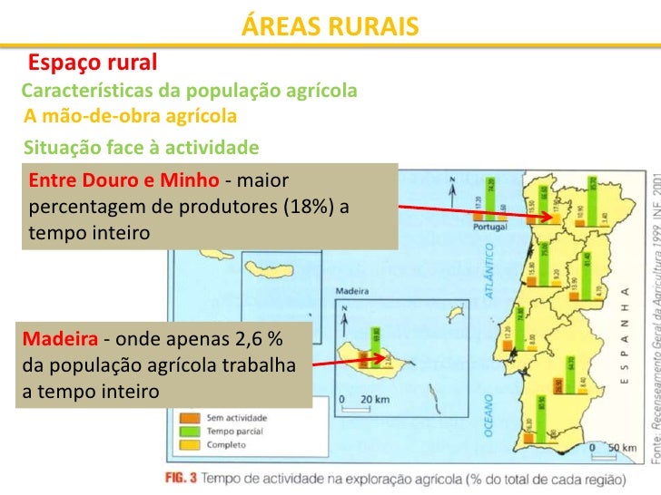 19. 19. ÁREAS RURAIS Espaço rural Características da população agrícola A mão-de-obra agrícola Situação face à actividade Entre Douro e Minho - maior percentagem de produtores (18%) a tempo inteiro Madeira - onde apenas 2,6 % da população agrícola trabalha a tempo inteiro